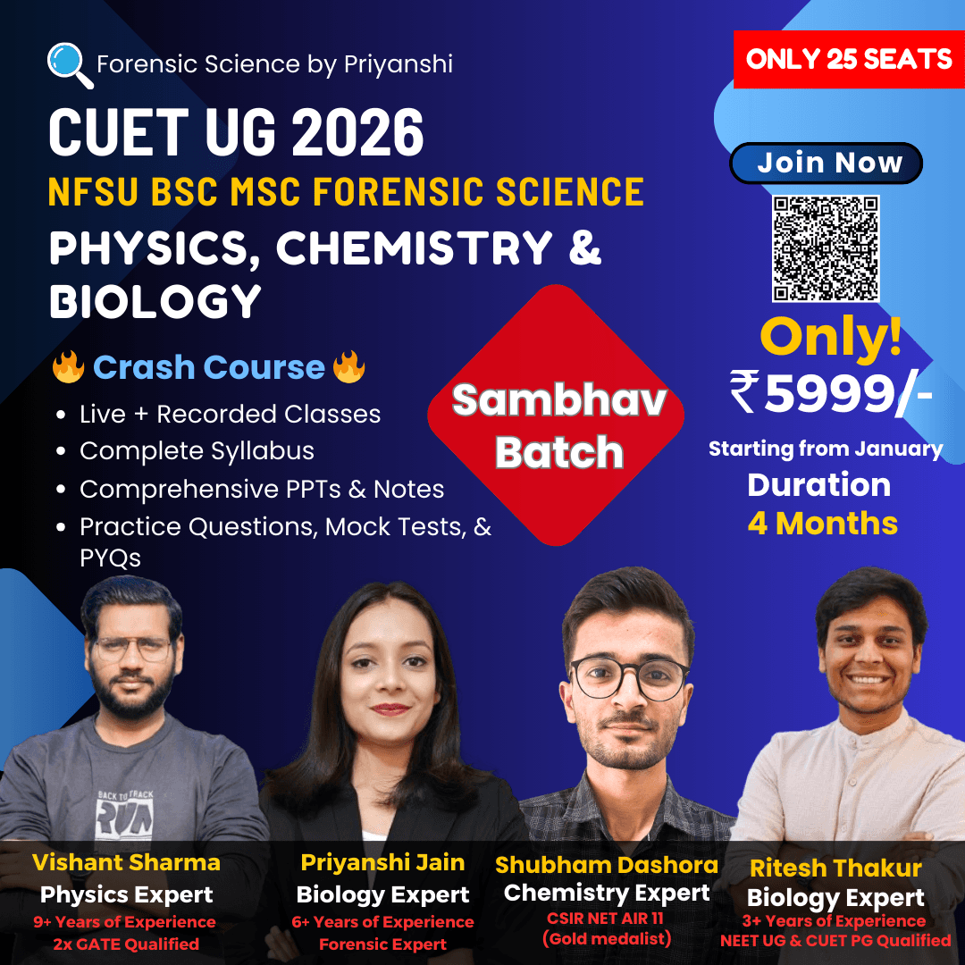 With an MSc in Forensic Science and over six years of teaching experience in Biology and Forensic Science, Priyanshi ma'am is a highly regarded educator and content creator dedicated to simplifying the complexities of this intriguing field. As the visionary behind a thriving educational YouTube channel, she blends her academic expertise and teaching experience to make forensic concepts accessible and engaging for students worldwide. Priyanshi mam's ability to break down challenging topics, coupled with her passion for empowering learners, has earned her a reputation as a trusted mentor in the Forensic Science community.